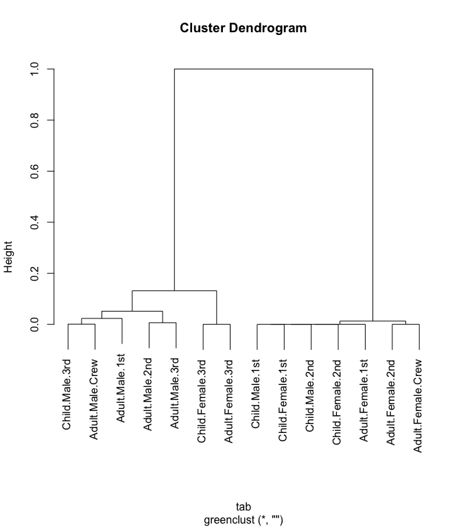 It does this by iteratively collapsing the rows two at a time, similar to other agglomerative hierarchical clustering methods. At each step, it selects the pair of rows whose combination results in a new table with the smallest loss of chi-squared. This process is often refered to “Greenacre’s Method”, particularly in the SAS community, after statistician Michael J. Greenacre.
