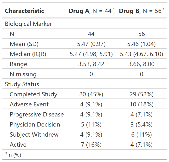 devtools::install_github("shannonpileggi/gtreg")The {gtreg} package creates tabular data summaries appropriate for regulatory submissions. The package builds the tables using {gtsummary}.