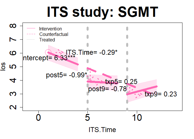 #> F-statistic: 27.43 on 7 and 712 DF, p-value: < 2.2e-16We have an interest in a 2nd interruption at month 9, which is specified with interrupt= c(5, 9) and its=“two”.