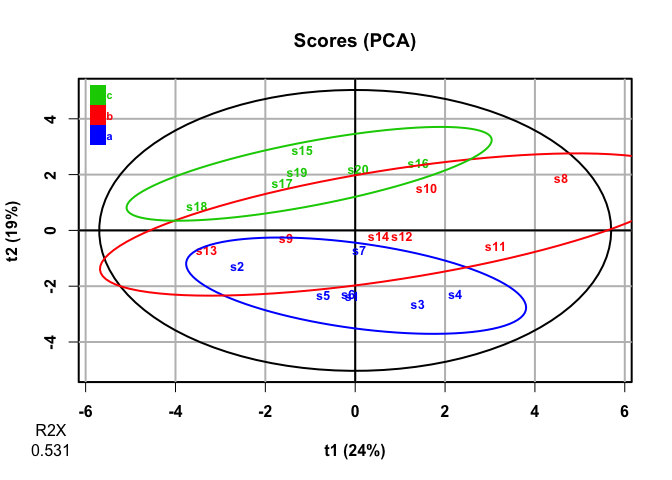pca <- opls(select(df2, -factor), fig.pdfC = "none", info.txtC = "none")