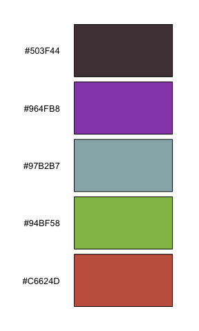 iwanthue(5, 0, 240, 0, 24, 0, 100, plot=TRUE) # shades