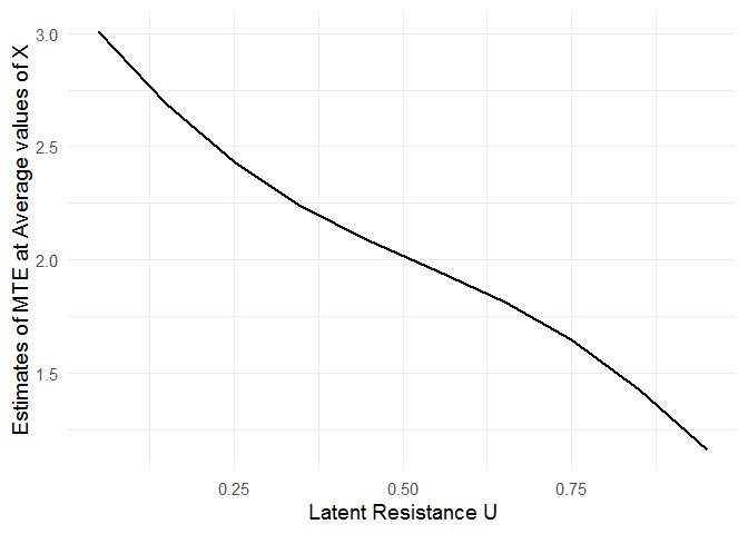 After fitting the MTE model, the mte_at() function can be used to examine treatment effect heterogeneity as a function of the latent resistance u.