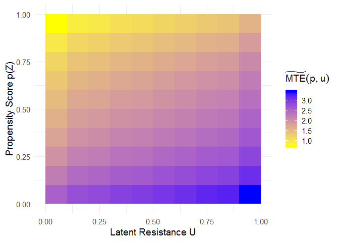The mte_tilde_at() function estimates the “MTE tilde”, i.e., the expected treatment effect conditional on the propensity score p and the latent resistance u. It reveals treatment effect heterogeneity as a function of both p and u.