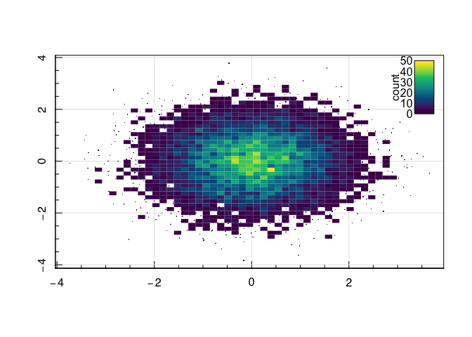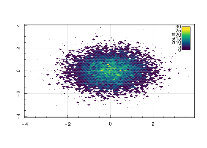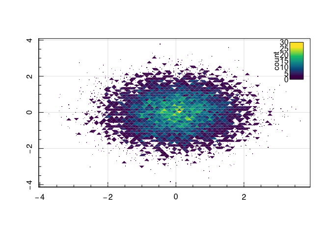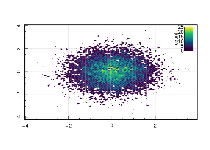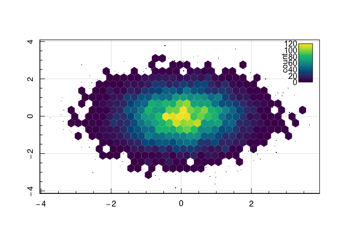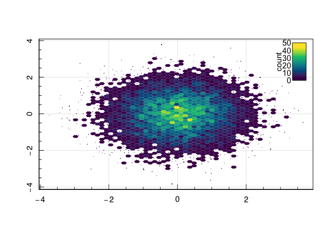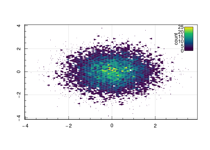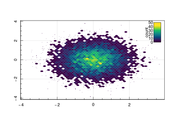 magbin(xydata, shape='hexagon', step=c(0.2,0.4)) #different aspect ratio hexagons