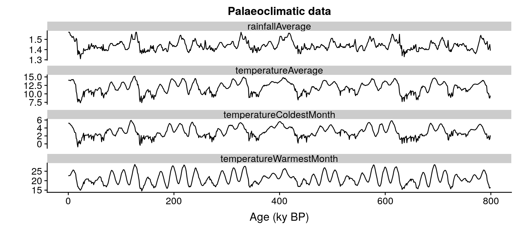 climate, with 800 samples dated in ky BP, and five climate variables: average temperature and rainfall, temperature of the warmest and coldest month, and oxigen isotope.