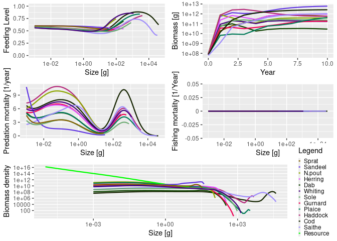 sim <- project(params, t_max = 10, effort = 0)The results of the simulation can then be analysed, for example via plots: