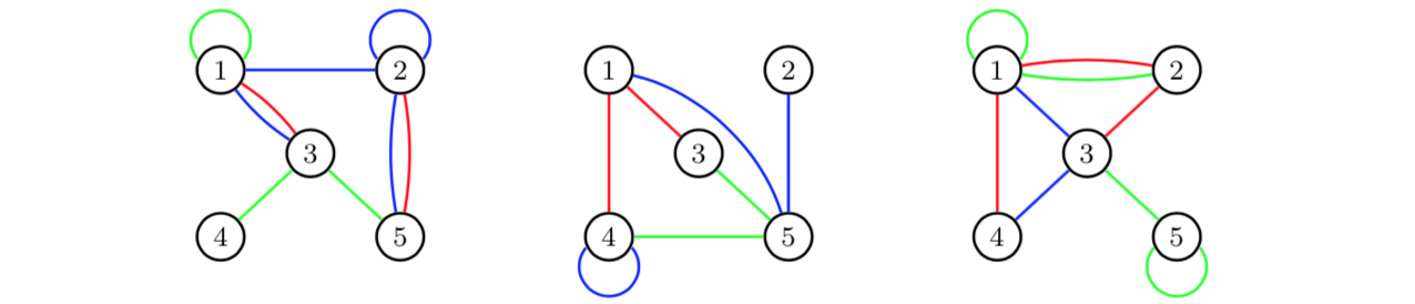 If we aggregate over time periods, we obtain for each edge category a multigraph for the total time period of three days: