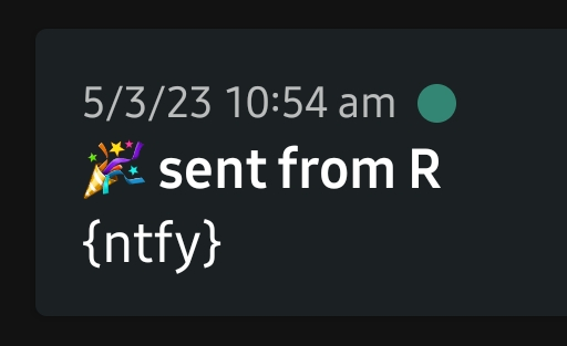 install.packages("ntfy")You can install the development version of {ntfy} from GitHub: