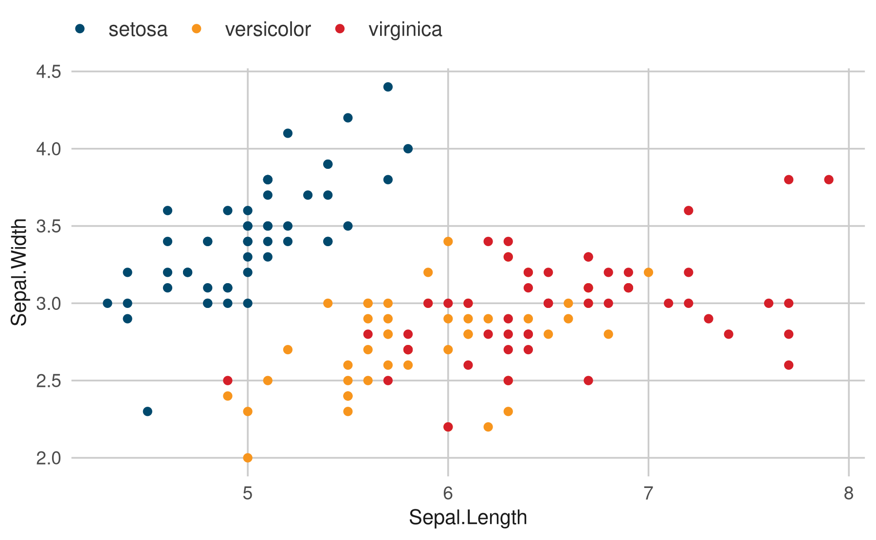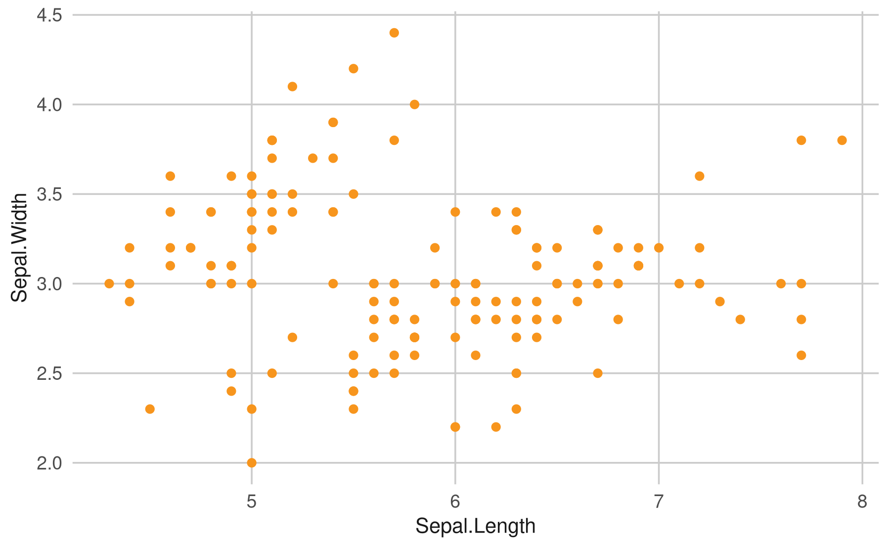 ggplot(data = iris, aes(x = Sepal.Length, y = Sepal.Width)) +