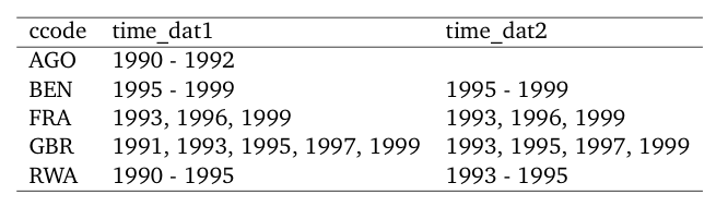 output_table_complex <- overview_tab(dat = toydata, id = ccode, time = list(year = toydata$year,