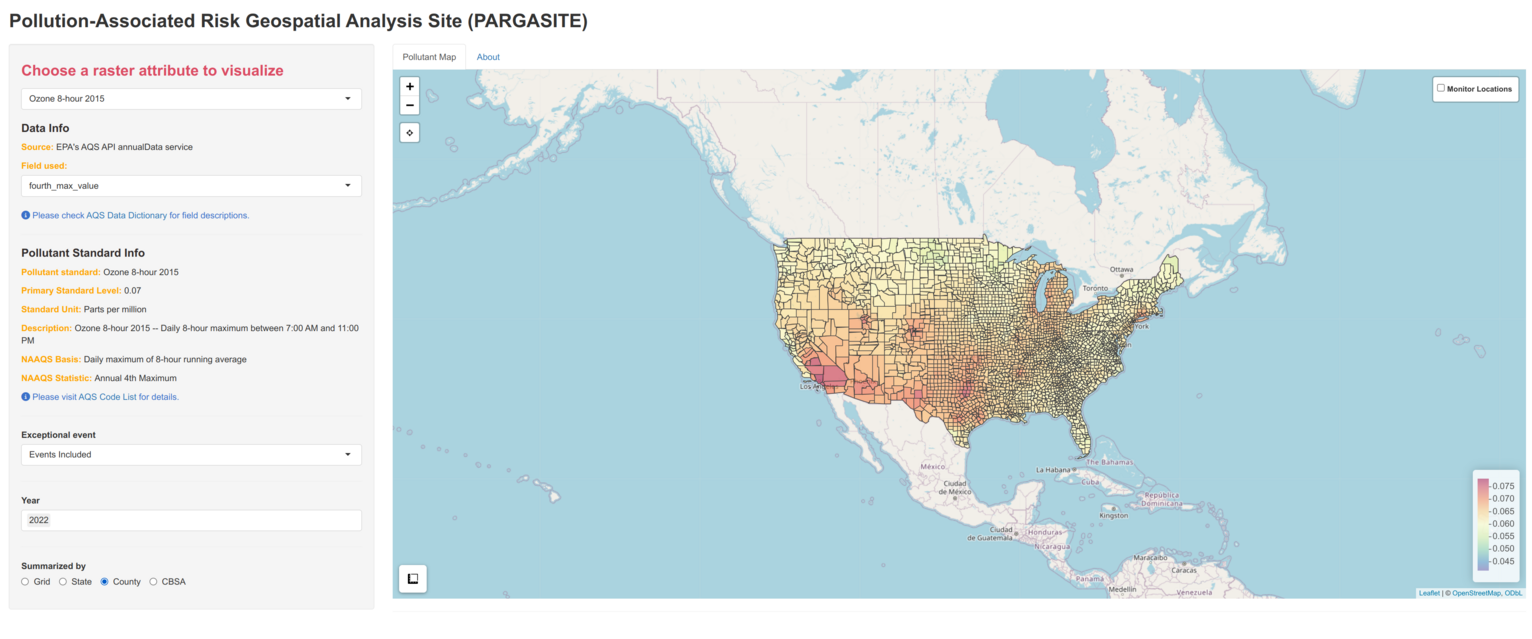 The pargasite package offers tools to estimate and visualize levels of major pollutants (CO, NO2, SO2, Ozone, PM2.5, and PM10) across the conterminous United States for user-defined time ranges. It provides functions to retrieve pollutant data from the Environmental Protection Agency’s (EPA) Air Quality System (AQS) API service for interactive visualization through a Shiny application, allowing users to explore pollutant levels for a given location over time relative to the National Ambient Air Quality Standards (NAAQS).