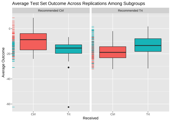 ## E[Y|Trt received = Trt recom] - E[Y|Trt received =/= Trt recom]: