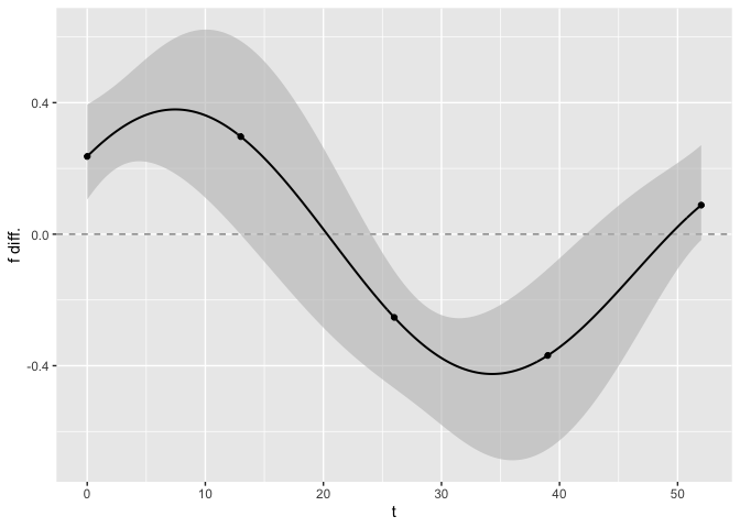 Finally, we can perform tests on the nonlinear functions. The first element of the list is an overall test of equality. If the p-value is \(< 0.05\), we reject the null hypothesis of equality and conclude that overall the two nonlinear functions are different. To obtain a comparison at each time point, confidence bands are computed, and a figure displaying these confidence bands is generated. For the time points associated with confidence bands that include \(0\), we cannot reject the null hypothesis that the nonlinear functions are the same for this time point. The data frame that is used to generate this figure can be found in the second element of the output list.