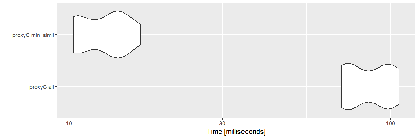 dm10k <- as.matrix(sm10k)With sparse matrices, proxyC is roughly 10 to 100 times faster than proxy.