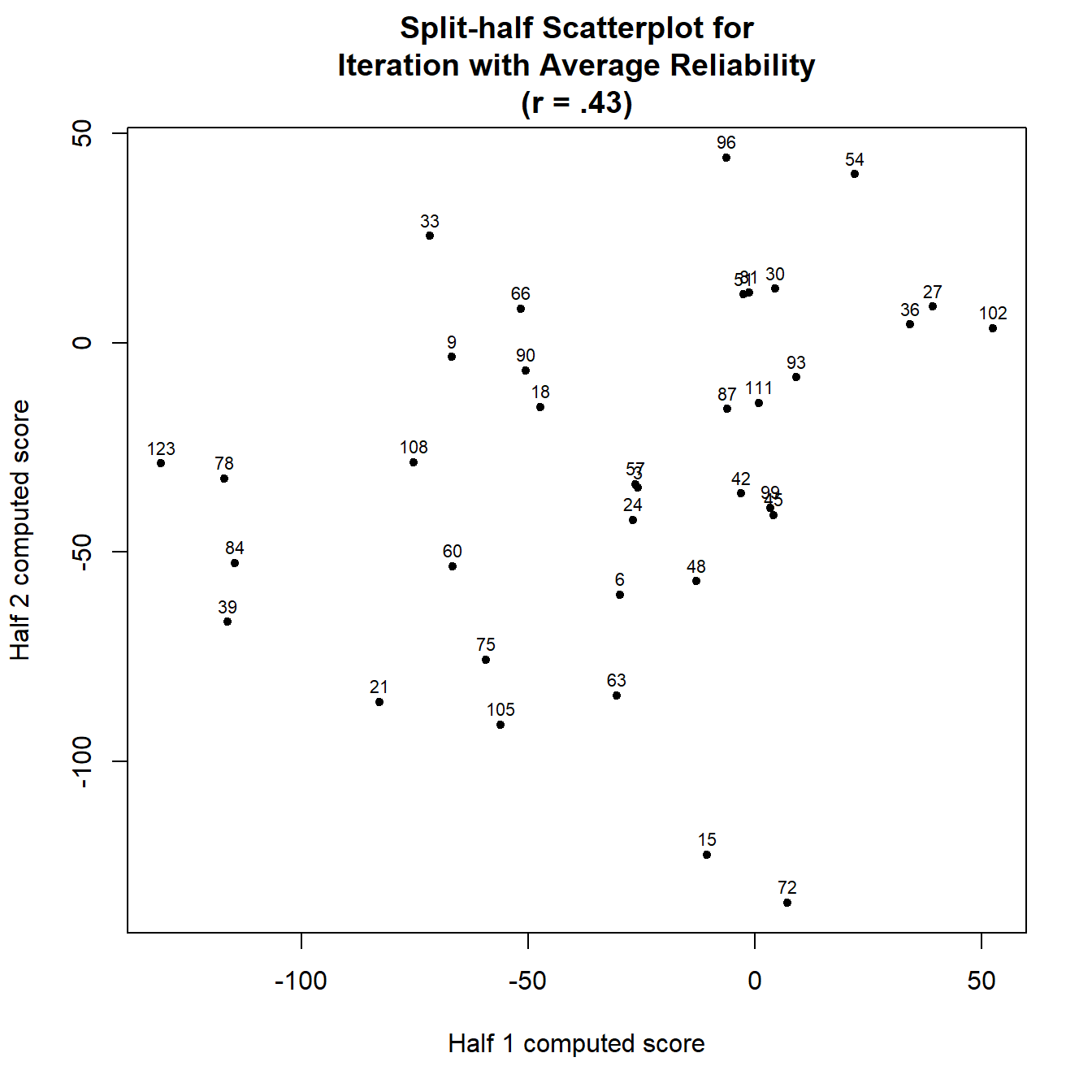 As discussed, if you’re using medians to aggregate your conditions, then the reliability of a medin-based score should be computed. We do so here within the context of a double-difference score, common to the approach-avoidance task. This has the following format: (push target - pull target) - (push control - pull control)