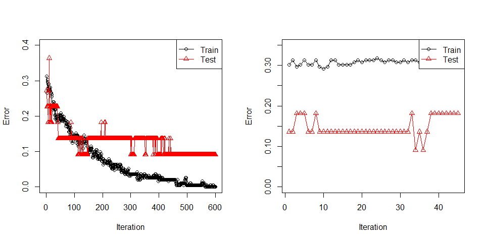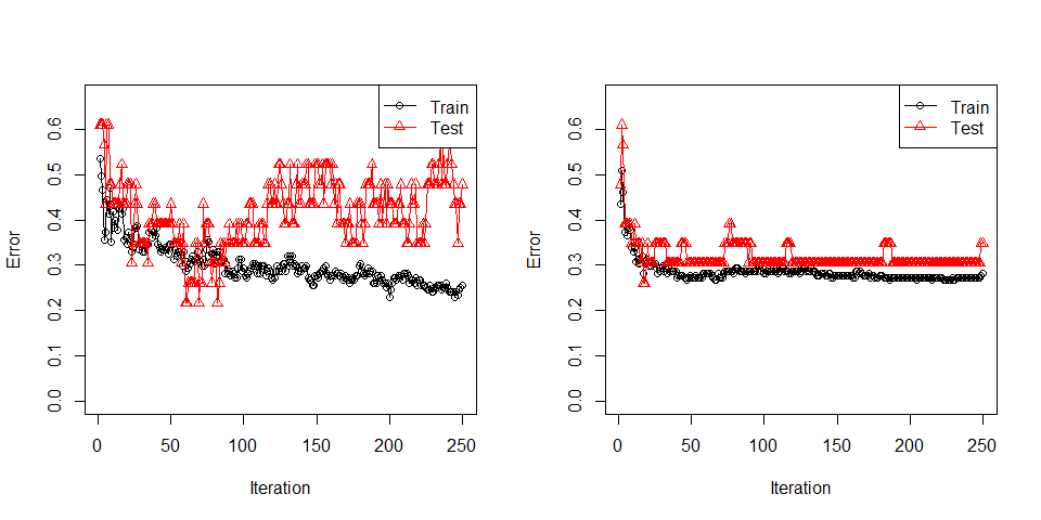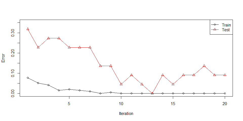 y_test <- y[-train_i]This is a two-class dataset. Let us use decision tree to build Discrete and Real AdaBoost models.