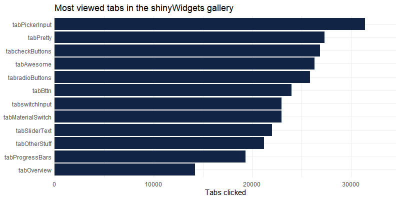 Which tabs (from sidebar in {shinydashboard}) in shinyWidgets gallery are the most seen :