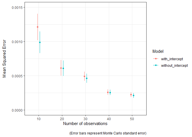 #> # ²mean_squared_error_mcseThe model estimates are closer to the truth (MSE is lower) as the sample used to fit the model increases in size. The Monte Carlo standard error can easily be visualised to convey the uncertainty in these estimates. The model without the intercept term seems to be a bit better, mostly when sample sizes are lower.