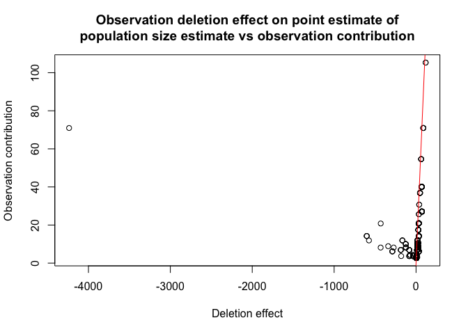 Finally let us check if we have any influential observations. We will do this by comparing the deletion effect of every observation on population size estimate by removing it entirely from the model (from population size estimate and regression) and by only omitting it in pop size estimation (this is what is called the contribution of an observation). If observation is not influential these two actions should have the approximately the same effect: