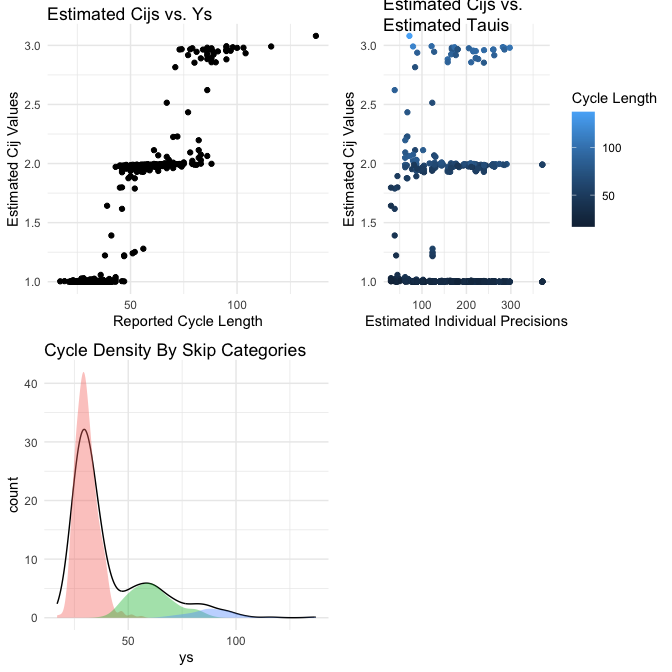library(skipTrack)First, we simulate data on 100 individuals from the SkipTrack model where each observed \(y_{ij}\) value has a 75% probability of being a true cycle, a 20% probability of being two true cycles recorded as one, and a 5% probability of being three true cycles recorded as one.