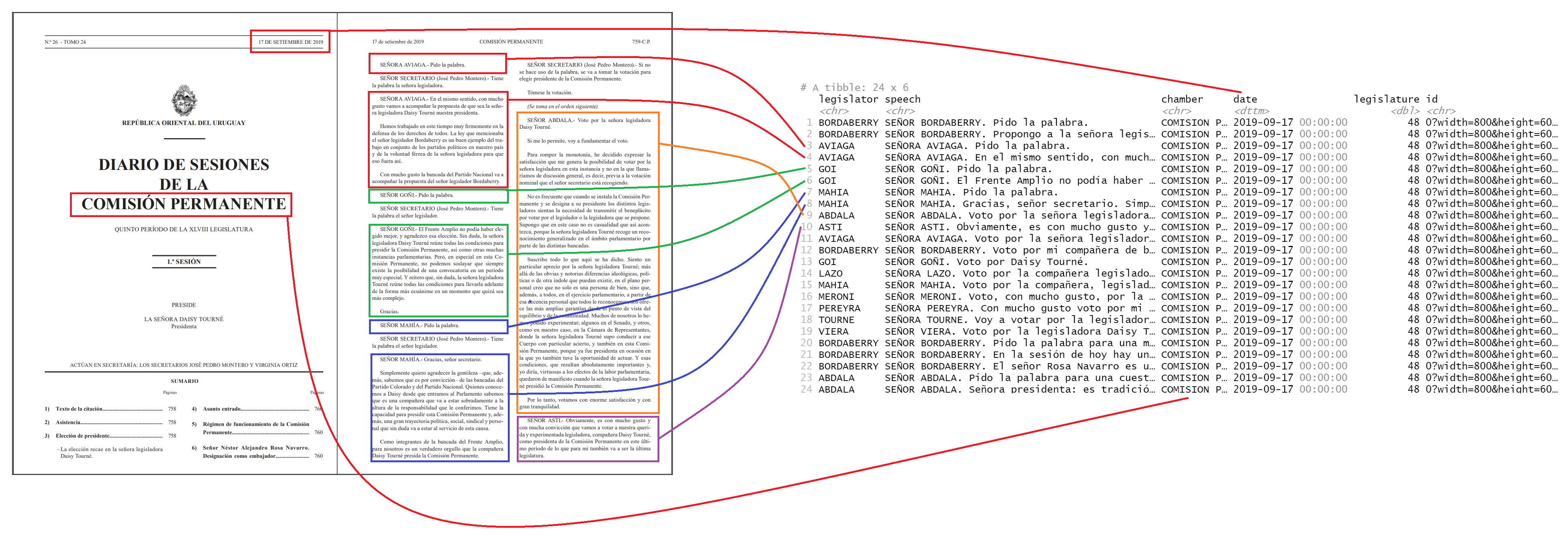 Converts the floor speeches of Uruguayan legislators, extracted from the parliamentary minutes, to tidy data.frame where each observation is the intervention of a single legislator.