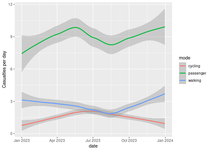 The next step is to gain a deeper understanding of stats19 and the data it provides. Then it’s time to pose interesting research questions, some of which could provide an evidence-base in support policies that save lives. For more on these next steps, see the package’s introductory vignette.