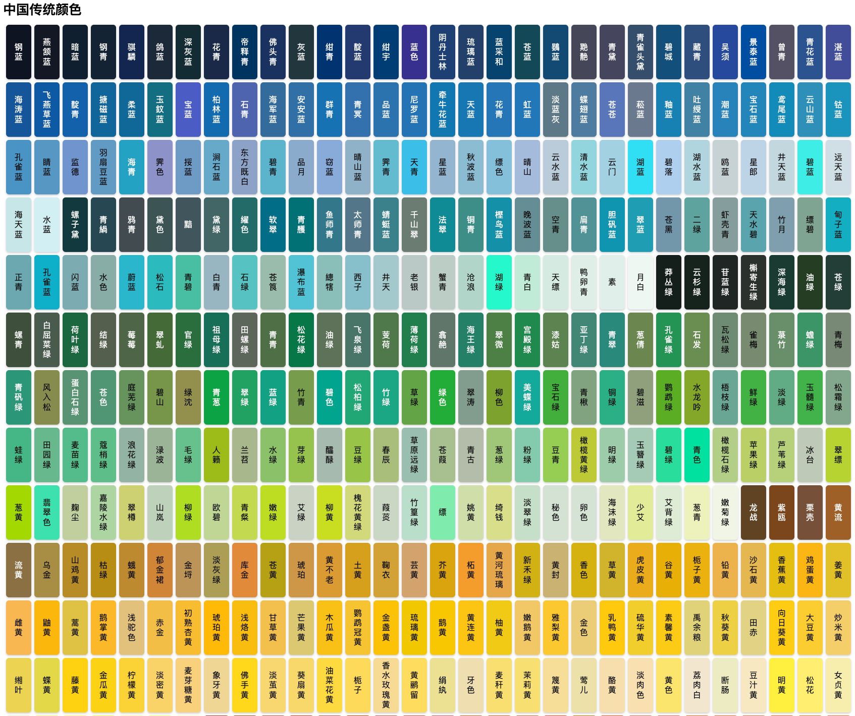The package includes a comprehensive Chinese traditional color system with 1058 representative colors. You can access colors by name (pinyin or Chinese), create color palettes, and visualize color collections.