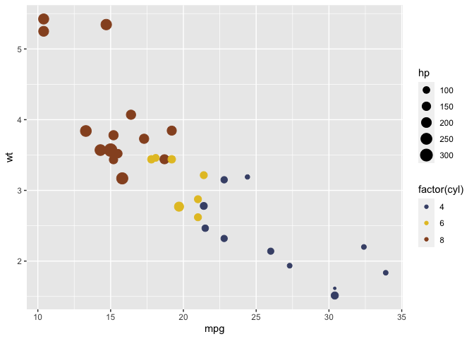 geom_point(aes(color = factor(cyl), size=hp)) +
