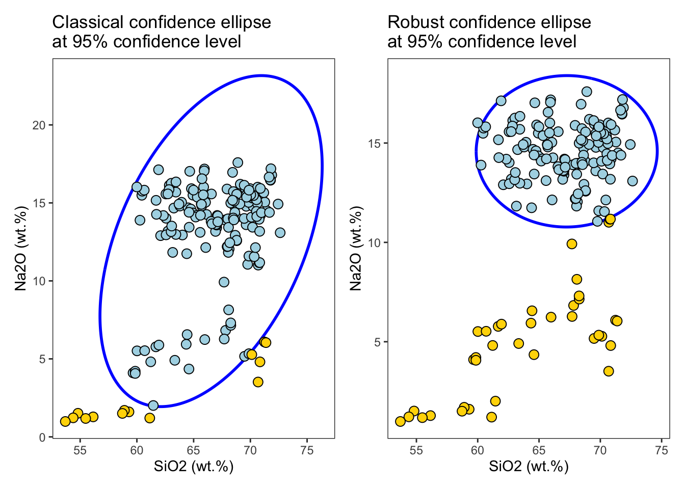 labs(x = "SiO2 (wt.%)", y = "Na2O (wt.%)", title = "Classical confidence ellipse\nat 95% confidence level") +