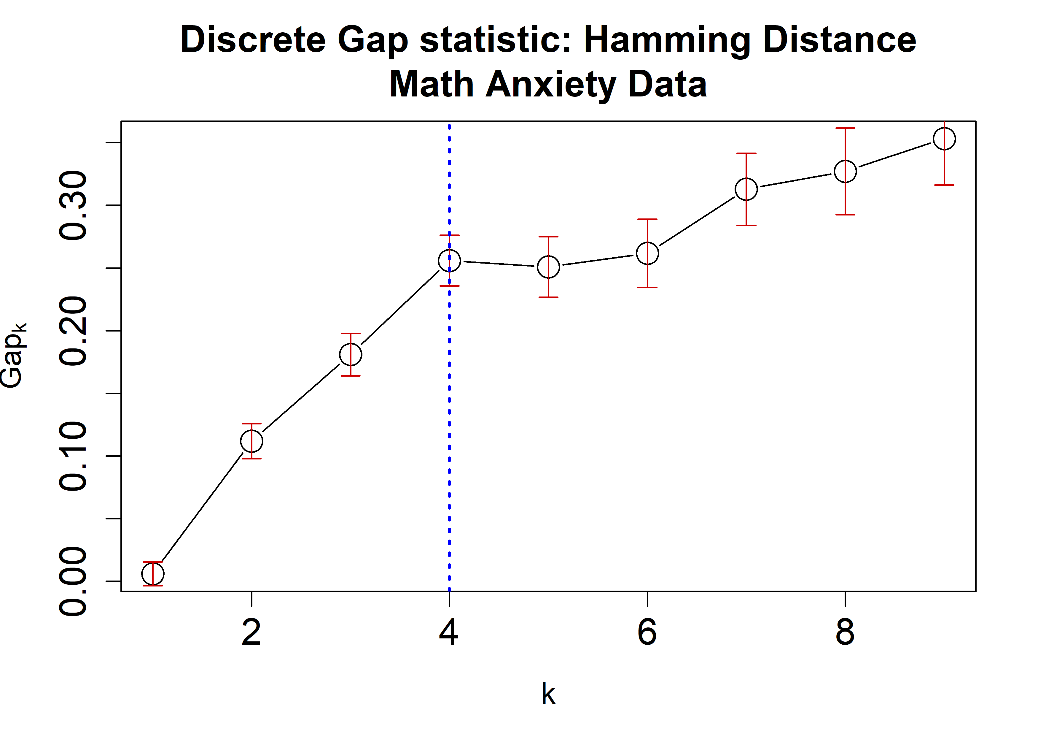 main = "Discrete Gap statistic: Hamming Distance\nMath Anxiety Data",