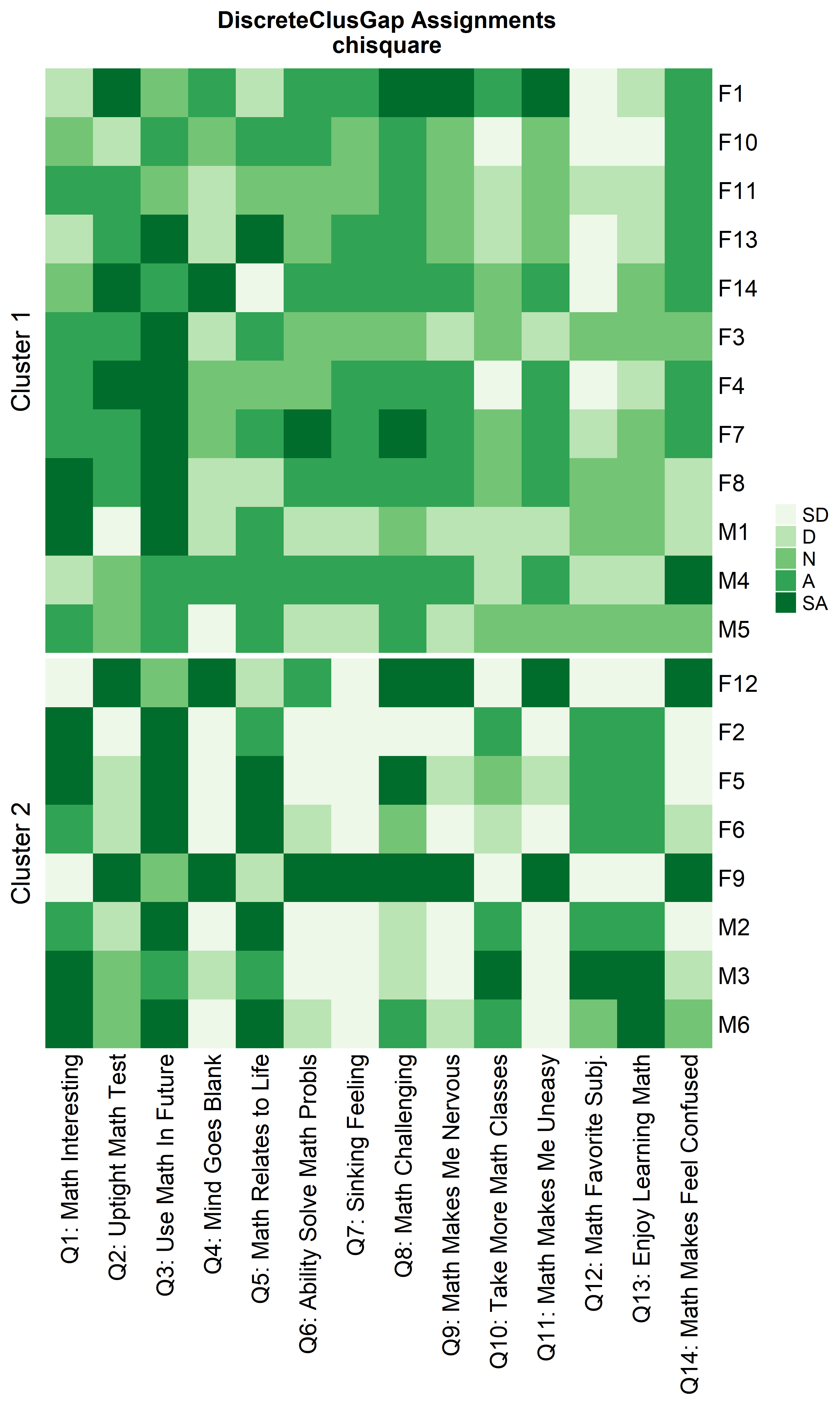 'Q13: Enjoy Learning Math', 'Q14: Math Makes Feel Confused')The dataset is visualized using a heatmap similar to the one produced