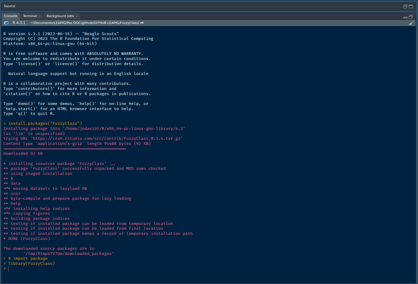 Once installed, you can load the FuzzyClass package into
