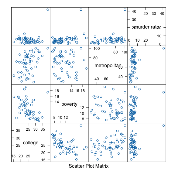 In “The Art and Science of Learning from Data, 5th edition” by Alan Agresti, Christine A. Franklin, and Bernhard Klingenberg, an interesting example about the 2003 United States crime data is presented to demonstrate the influence of outliers in the classic linear regression model. This example is very compelling and partially motivates the construction of the Bayesian modal regression based on the GUD family. This data contains the murder rate, percentage of college education, poverty percentage, and metropolitan rate for the 50 states in the United States and the District of Columbia (D.C.) from 2003. The murder rate is defined as the annual number of murders per \(100{,}000\) people in the population. The poverty percentage is the percentage of residents with income below the poverty level, and the metropolitan rate is defined as the percentage of population living in the metropolitan area. In the exploratory data analysis, we present the conditional scatter plot matrices below.