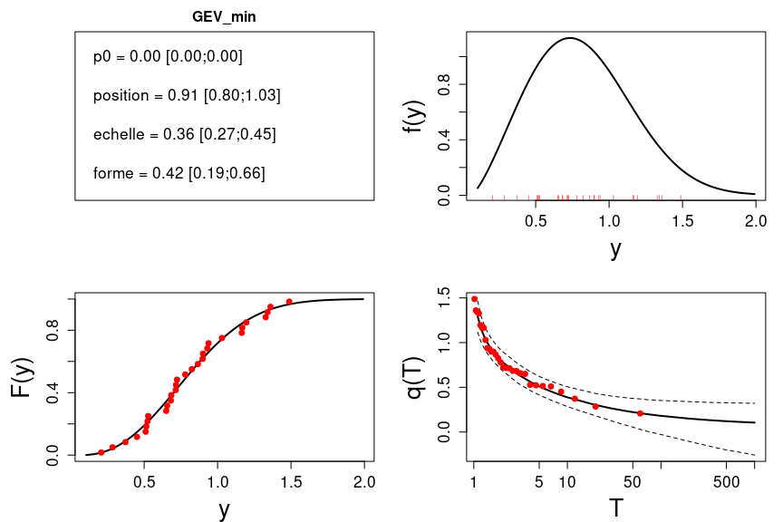 L’estimation de la distribution ‘GEV_min’ est illustrée ci-dessous. Comme on s’interesse aux extrêmes bas il faut penser à modifier l’option invertT comme précédemment décrit.