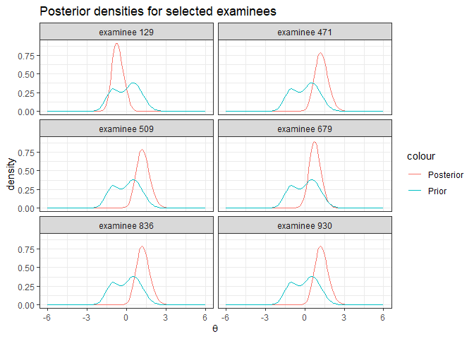 labs(title="Posterior densities for selected examinees", x=expression(theta), y='density')+
