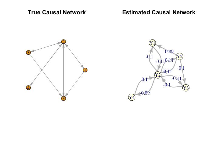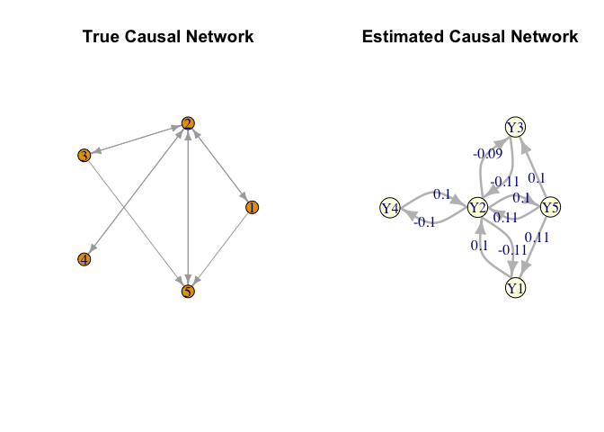 library("MR.RGM")We offer a concise demonstration of the capabilities of the RGM function within the package, showcasing its effectiveness in computing causal interactions among response variables and between responses and instrumental variables using simulated data sets. Subsequently, we provide an example of how NetworkMotif can be applied, utilizing a specified network structure and GammaPst acquired from executing the RGM function.