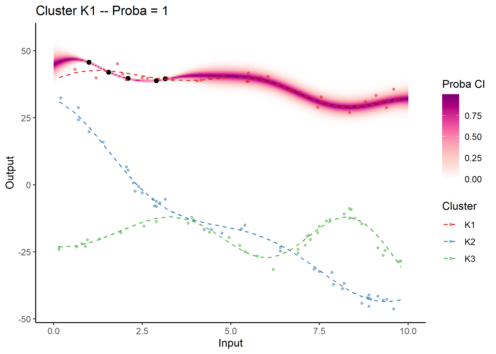 #> The mixture probability of the cluster K1 is 1. Therefore, the predictive distribution is Gaussian and the associated credible interval can be displayed.