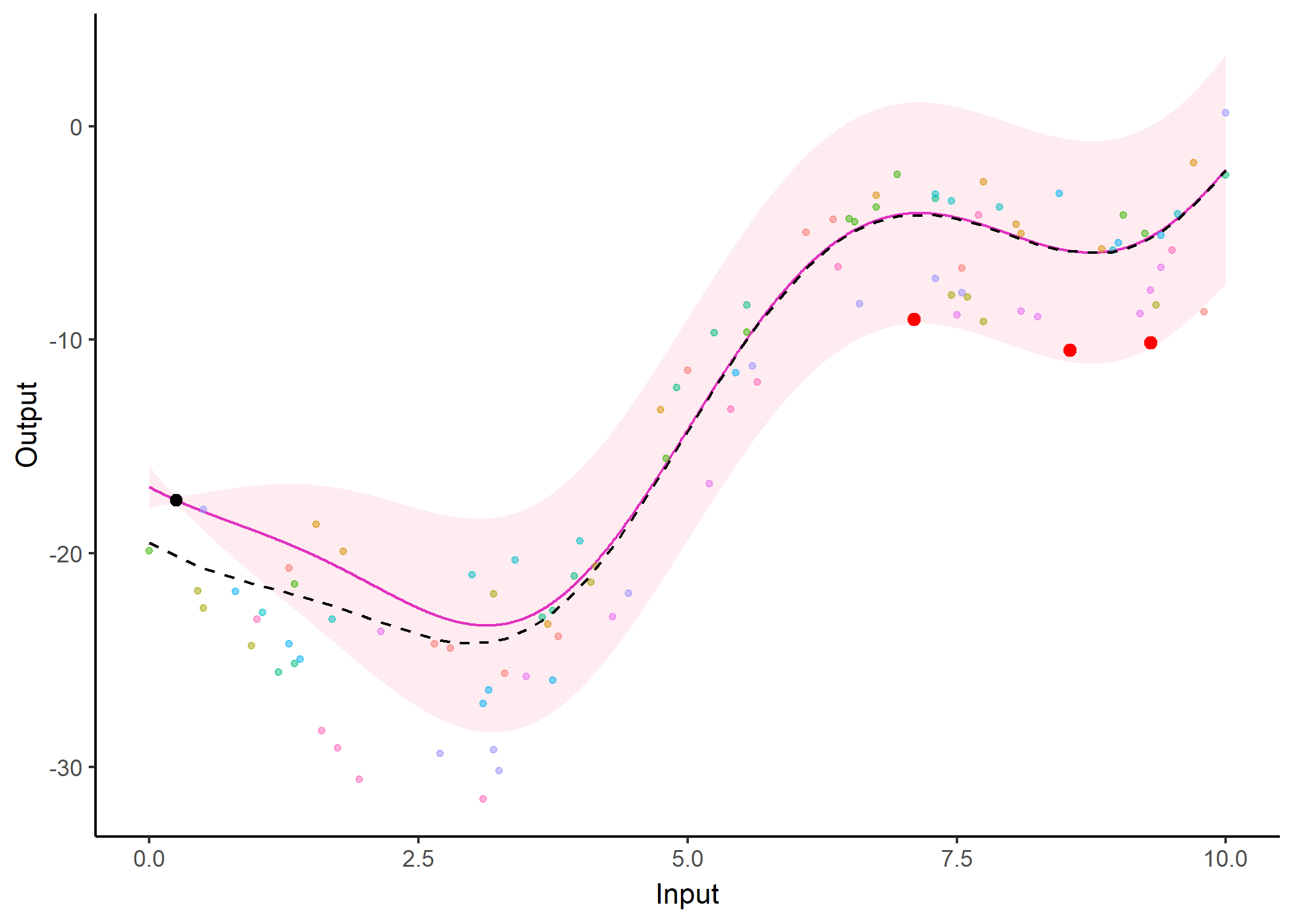 Additionally, it is also possible to create animated representations by using functions that generate GIFs. For instance, below, the true testing points have been represented as red dots and we can observe how the prediction evolves as we add more data points to our prediction dataset.