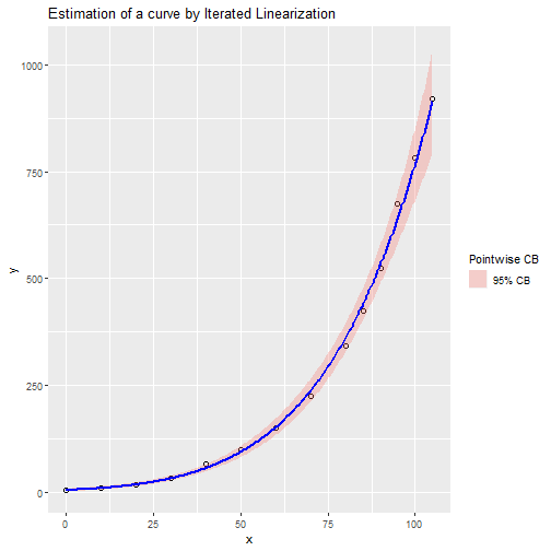 plot(st1, signif.level = 0.05, interval = "conf", main  = "Estimated function by iterated linearization")