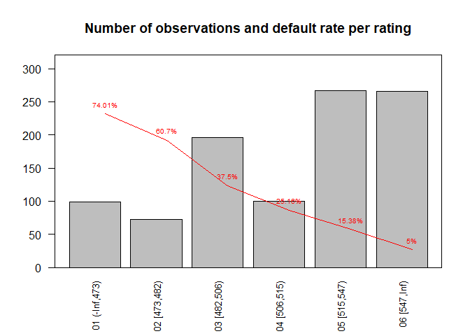 main = "Number of observations and default rate per rating")
