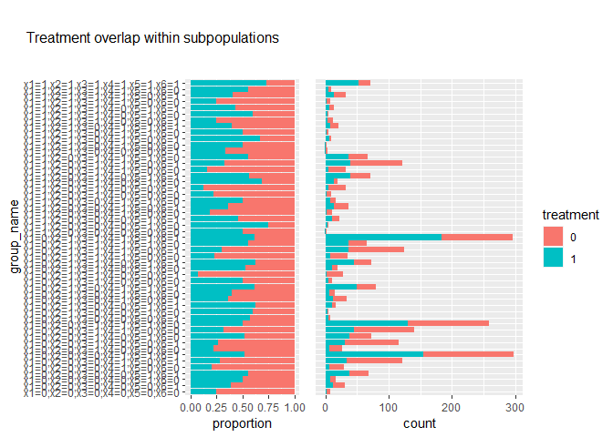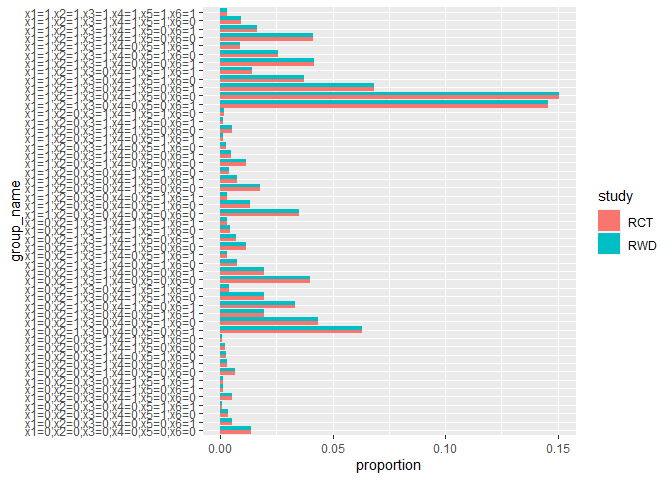 source.obj.rep$EstimateRep(stratification = c("x1","x3","x4","x5"))This step diagnoses model assumption for G-computation (covariats balance for IPW), treatment overlap assumption, outcome overlap assumption, and sampling overlap assumption.