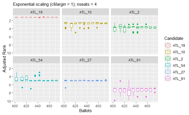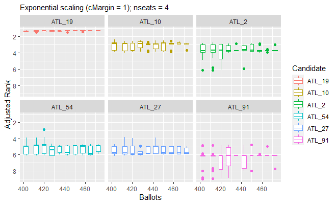 testFraction may also be useful in determining the extent to which the safety of the preliminary results of an STV election is affected by its quota method. In the case of the 2016 Yale Senate election, the use of a Droop quota, rather than a Hare quota, has a significant influence over the partial results for the fourth seat. This influence is readily explained by the fact that multiple rounds of elimination were required before any candidate achieved the quota. Fewer rounds of elimination are required to reach a Droop quota, so fewer votes are transferred before each seat is filled – which will differentially affect the vote-counts of the candidates still in play for the remaining seats. Furthermore, the Cambridge method of transferring votes may have been employed in the real-world Yale Senate election. Under these rules, the initial numbering of the ballots determines the ballot papers which are consulted when a candidate’s surplus votes are transfered. As noted in the tests of STV v1.0.2, if ballots are selected for a vote-transfer process by a pseudorandom number generator, the seeding of this generator affects the outcome of the election. The per-candidate boxplots in the last decile of vote-counting in our experimental results below (using the Droop quota with fractional vote transfers) illustrate this phenomenon. The median result of the last decile of ballot-counting show ATL_2 having a very small margin of victory for the third seat, and ATL_54 having a slight advantage over ATL_27 in a very close race for the fourth seat.