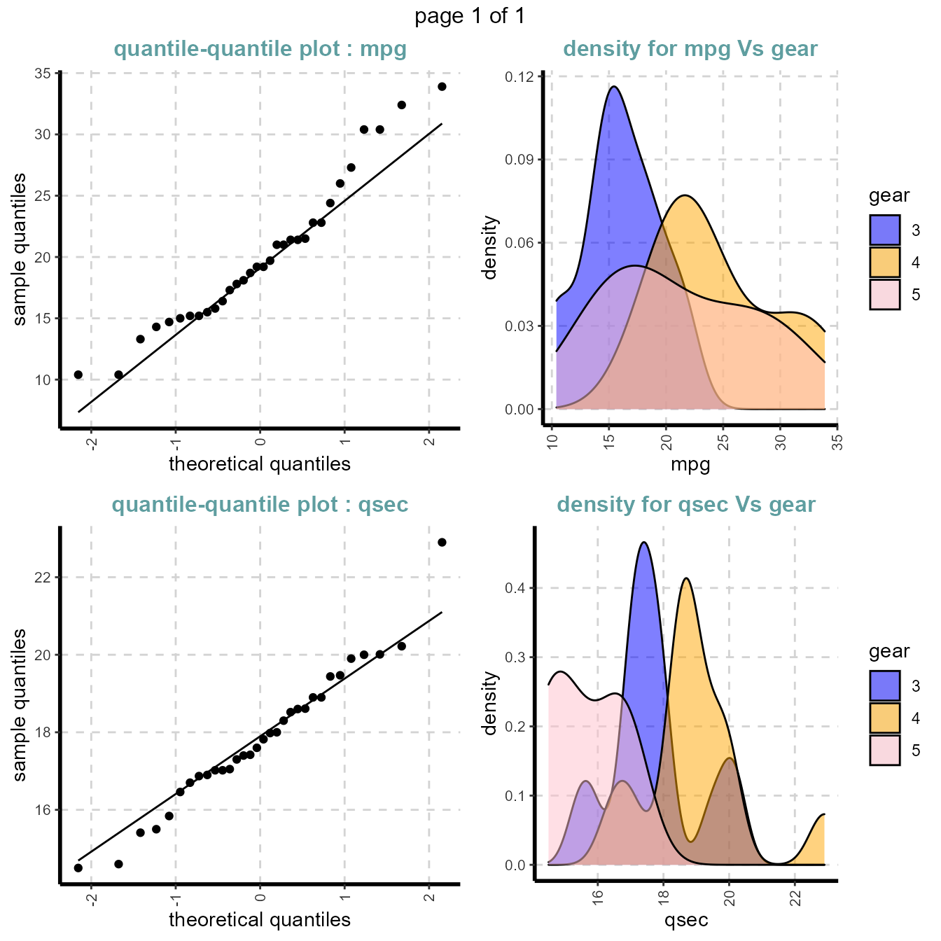 ExpNumViz(mtcars,target="gear",type=2,nlim=25,fname = file.path(tempdir(),"Mtcars2"),Page = c(2,2))