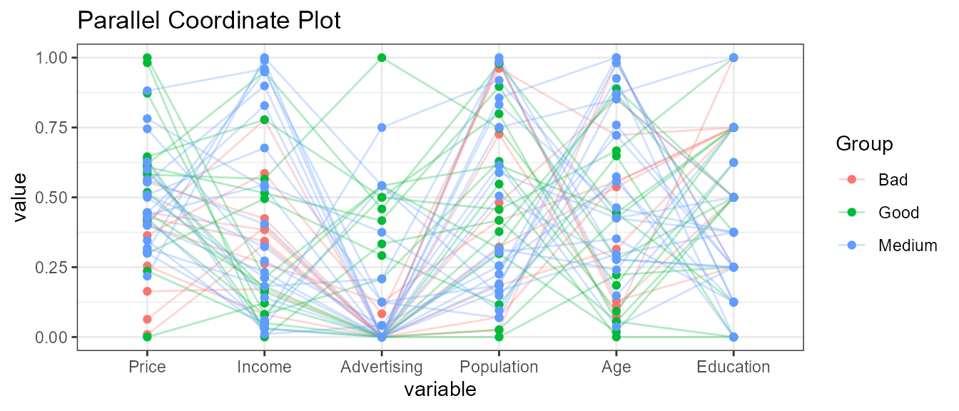 ExpParcoord(CData,Group="ShelveLoc",Stsize=c(10,15,20),Nvar=c("Price","Income","Advertising","Population","Age","Education"))