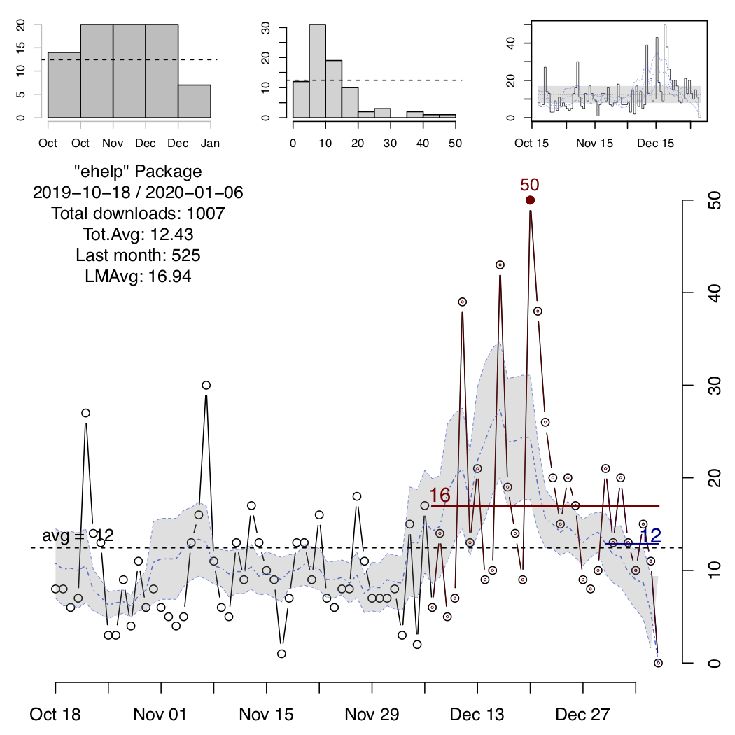 Two more “fixed” averages are presented in the main plot, indicating the average number of downloads for the package in the last two “units” of time, eg last month and last week, or last six-months and last month, etc. The absolute maximum number of downloads within the period of time, is also displayed as a filled dot and the actual value.
