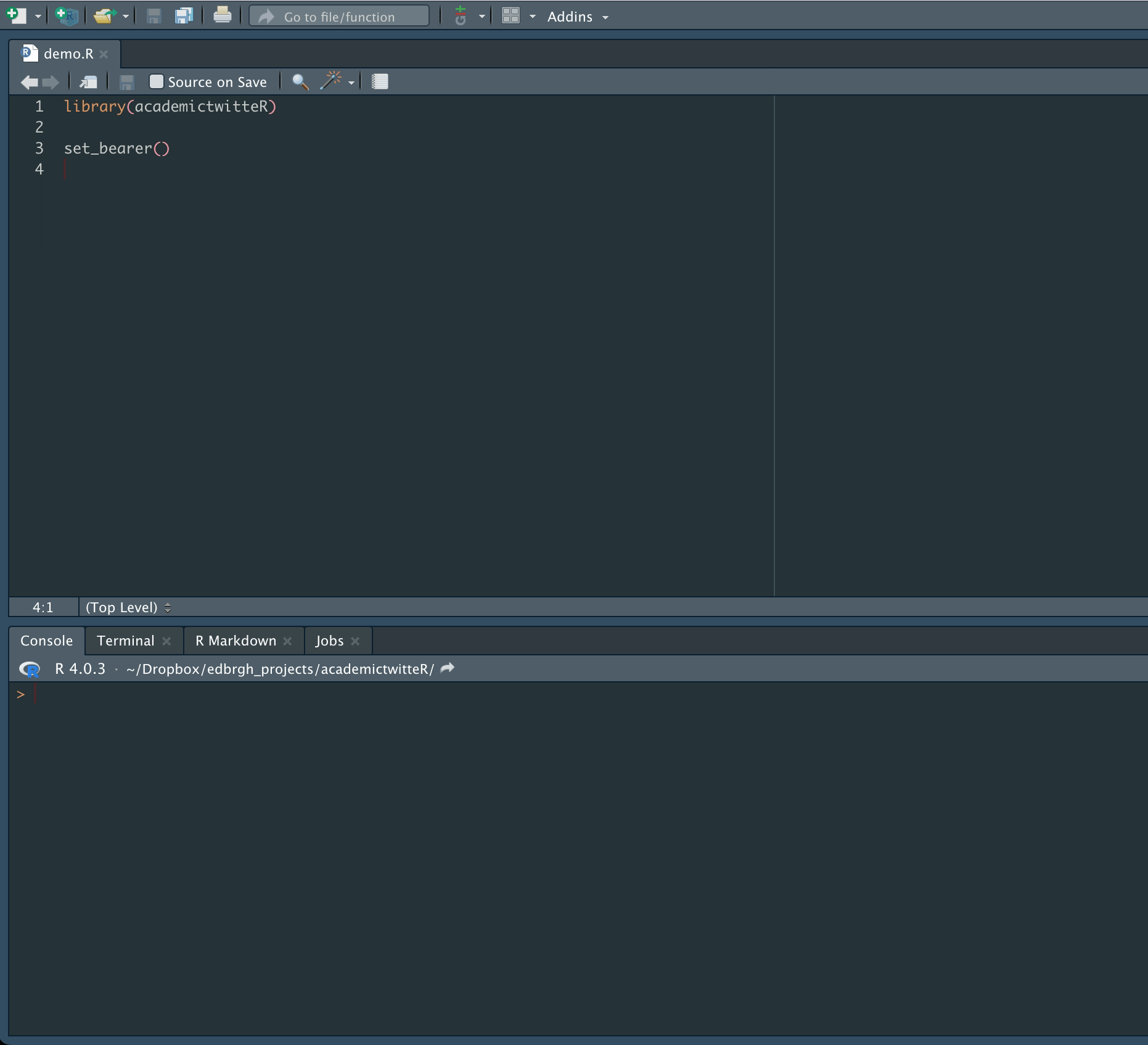 The first task is set authorization credentials with the set_bearer() function, which allows the user to store their bearer token in the .Renviron file.