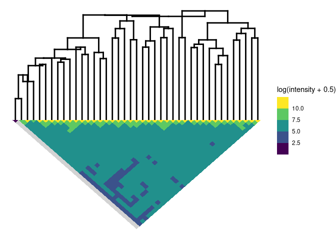 plotSim(intdata(binned), dendro = fitB) # default: log scale for colors