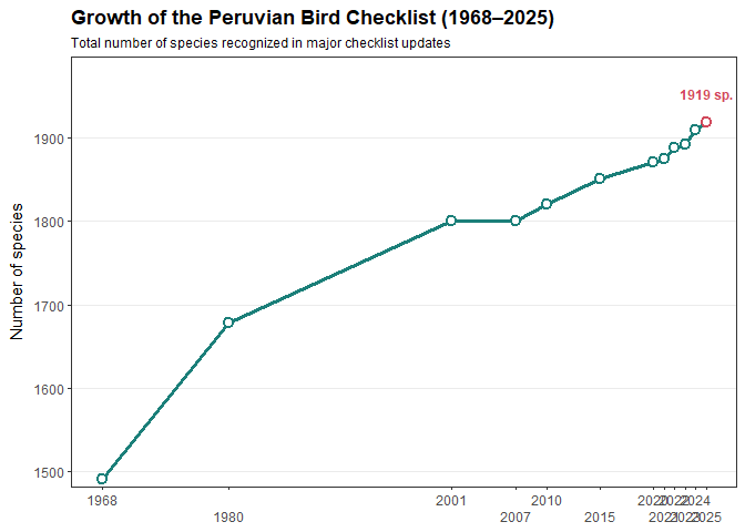 The chart shows the steady increase in the number of bird species recorded in Peru from 1968 to 2025, reflecting continuous research and improvements in taxonomic resolution:
