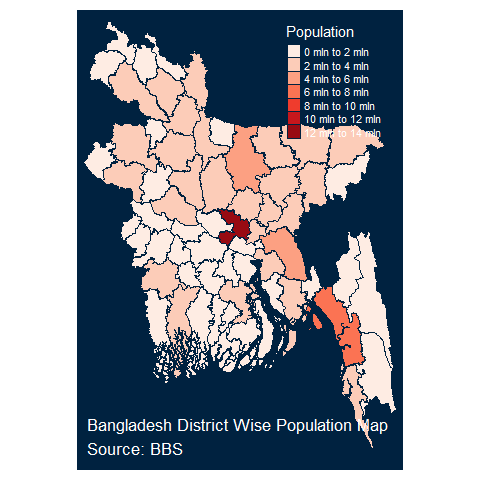 "Bangladesh District Wise Population Map\nSource: BBS",