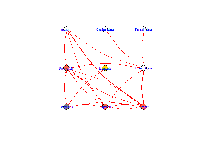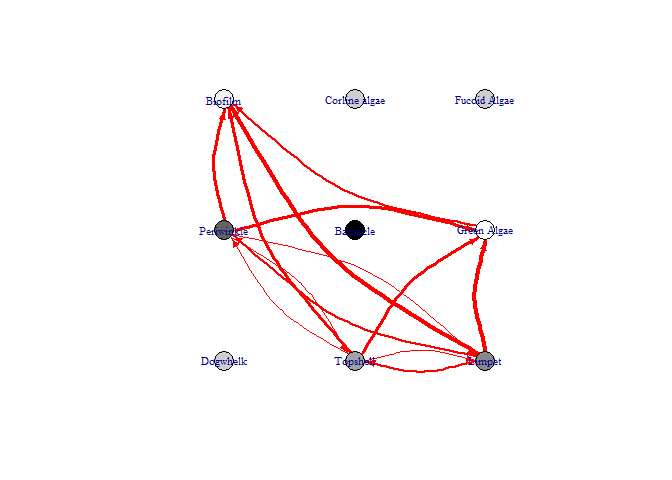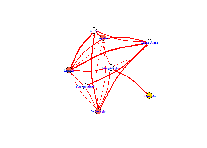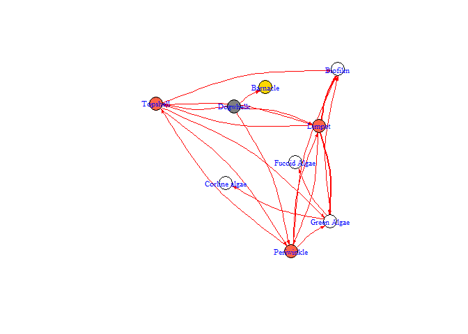 #> 6 -3 -1The details of this interaction matrix are discussed in the main text of the paper, which is under review in Ecological Informatics [we will update this shortly]. Essentially it explains direct interactions between what is here the species or taxon in the row on the species or taxon in the column.